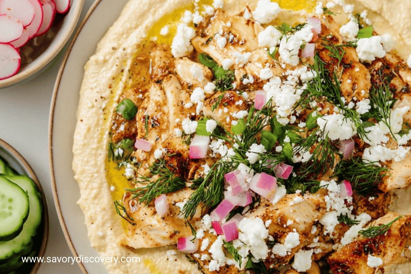 When you build your bowl, think about making it pretty. Spread the hummus like a soft bed. Then lay the chicken slices on top nicely. Finally, sprinkle all the toppings over everything.