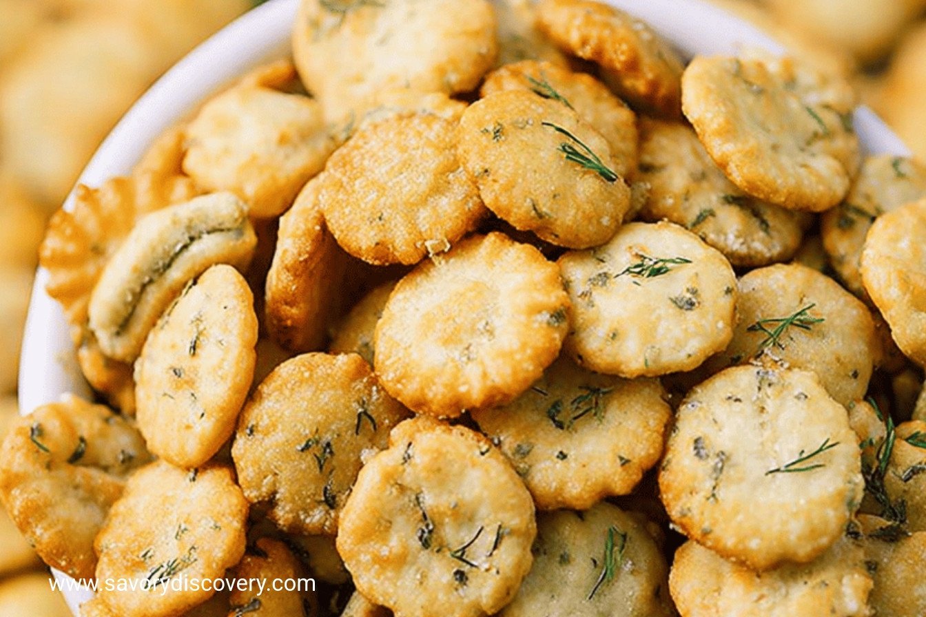- Step 2: Now, grab a medium bowl. Put in the fresh dill, garlic powder, pepper, salt, and oil. Stir it all together. Doesn’t that smell amazing? Then, gently toss in the oyster crackers. (A hard-learned tip: toss them slowly so they don’t break!). Make sure each cracker gets a little coat of the green oil.