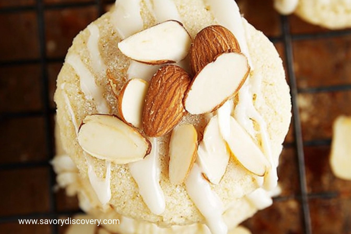 Step 6: Let the cookies cool on a rack. Now, for the fancy part! Stir powdered sugar, almond extract, and cream in a bowl. Drizzle this pretty icing over your cookies. Sprinkle on the toasted almonds for a lovely crunch.