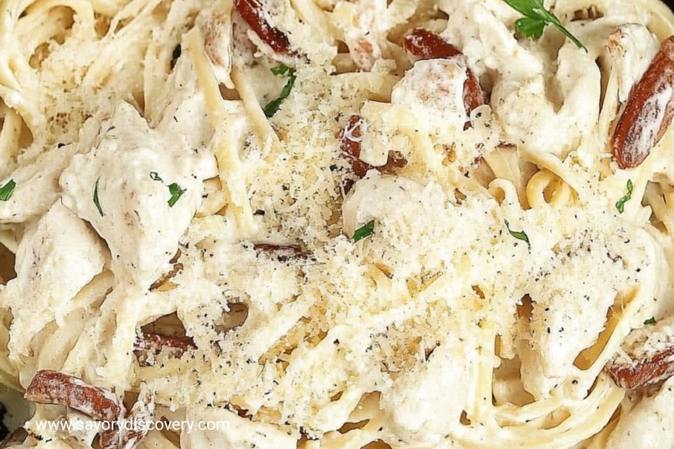 A rich and comforting pasta bake featuring tender chicken, crispy bacon, and a creamy, cheesy sauce.
