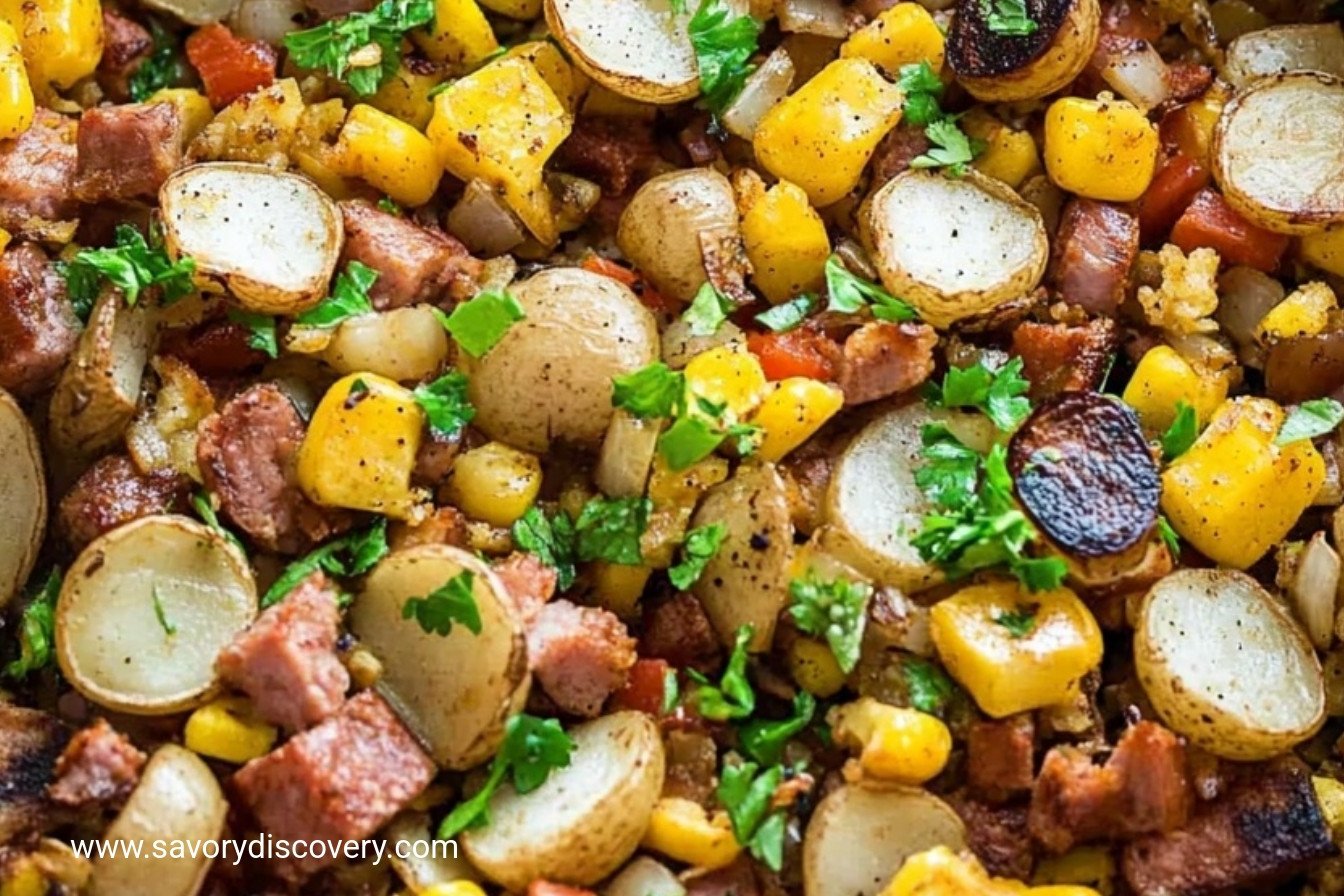 A hearty and flavorful breakfast hash cooked over a campfire or stovetop, featuring crispy potatoes, kielbasa sausage, corn, and green chiles.