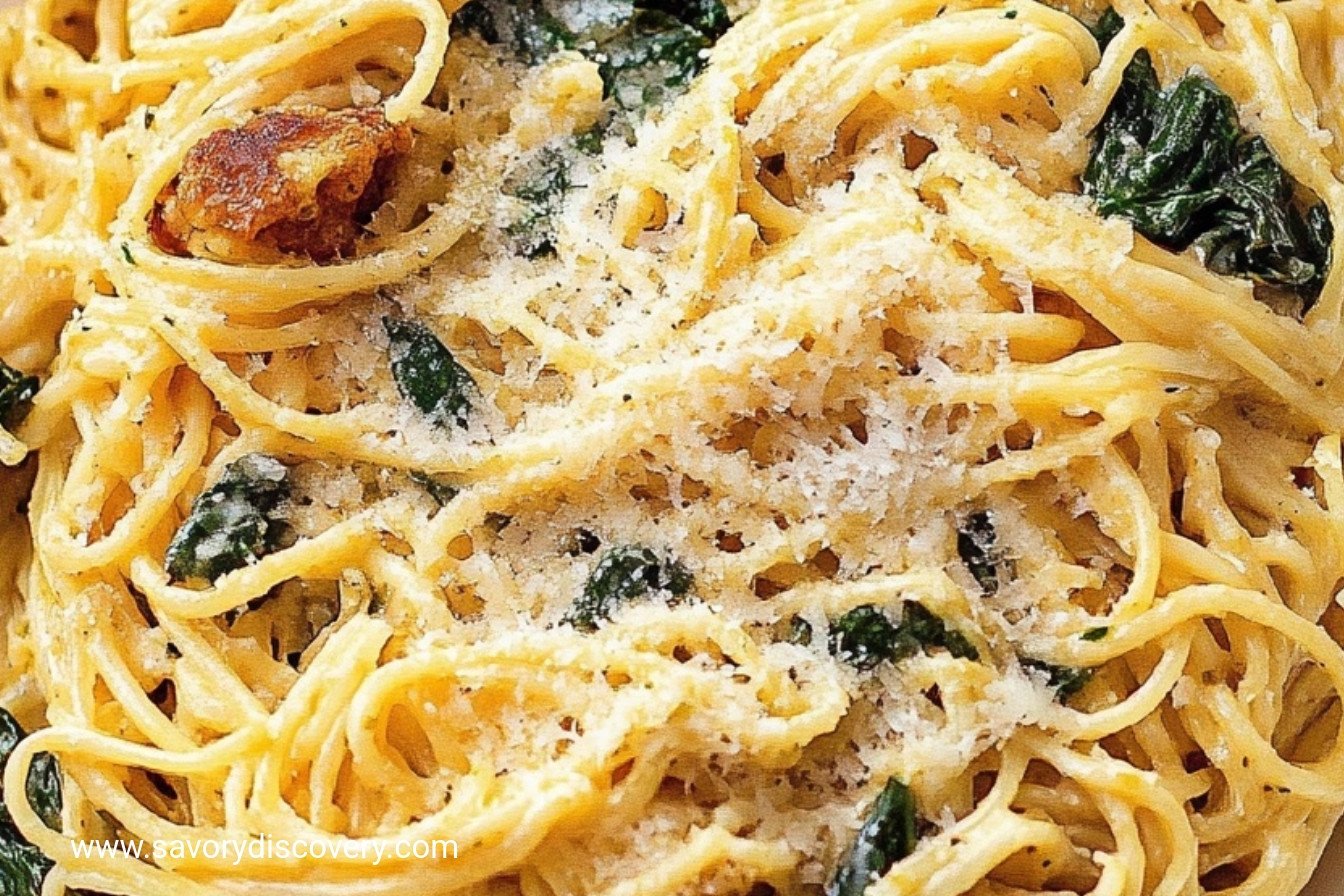 A rich and comforting pasta bake featuring a creamy Asiago cheese sauce, fresh spinach, and perfectly cooked spaghetti.