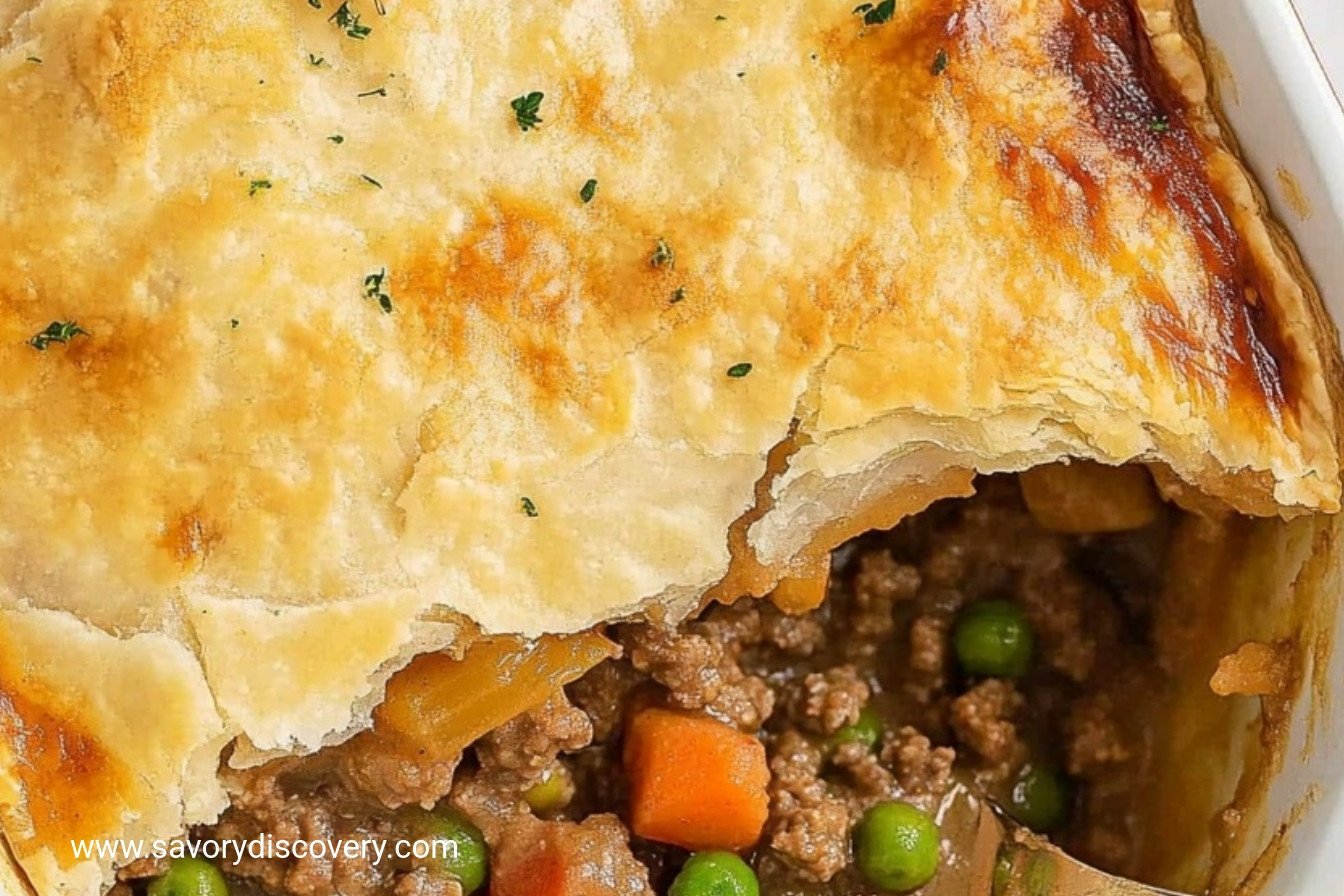 A comforting and hearty homemade pot pie filled with savory ground beef and vegetables, all baked under a golden, flaky crust.