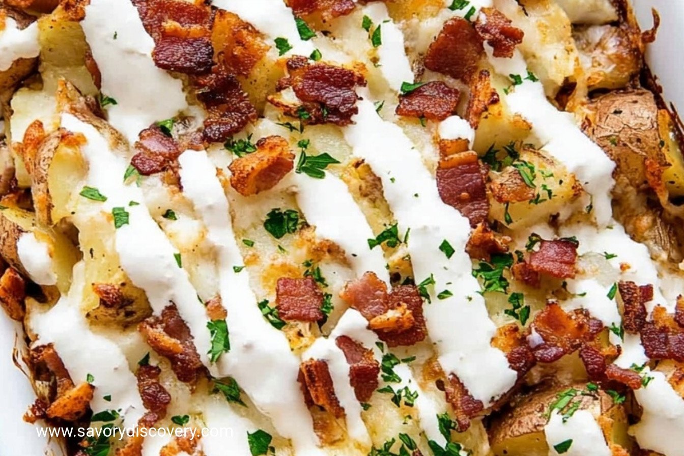 Chicken Bacon Ranch Roasted Potato Bake is a hearty and flavorful one-pan meal, featuring crispy roasted potatoes, tender ranch-marinated chicken, and a cheesy bacon topping.