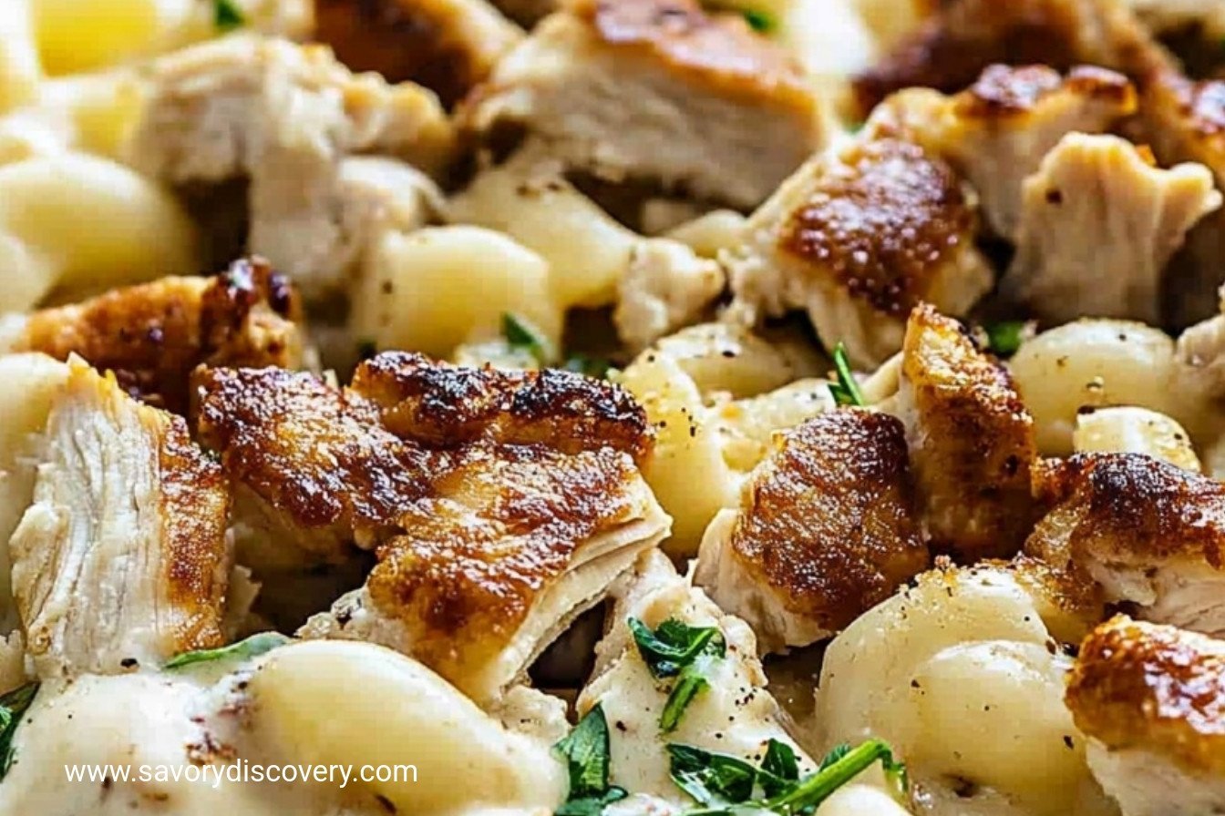 Step 5: Time to bring it all together. Stir your cooked noodles right into that gorgeous cheese sauce. Then, top it with that beautiful chicken. Don’t forget the crispy bacon and a sprinkle of parsley. What’s your favorite cozy dinner on a rainy day? Share below!