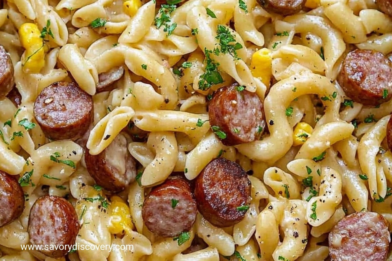 A hearty and flavorful one-pan meal featuring smoky sausage, tender pasta, and sweet corn in a creamy, cheesy Cajun-spiced sauce.