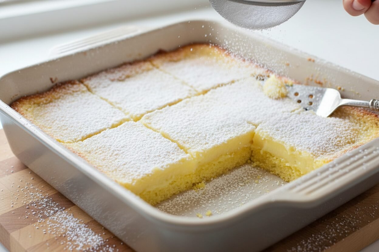 Step 6: The final touch is my favorite. Take the powdered sugar you saved. Dust it over the top like a light snowfall. Then, cut your masterpiece into squares. Now, you have a plate full of sunshine.