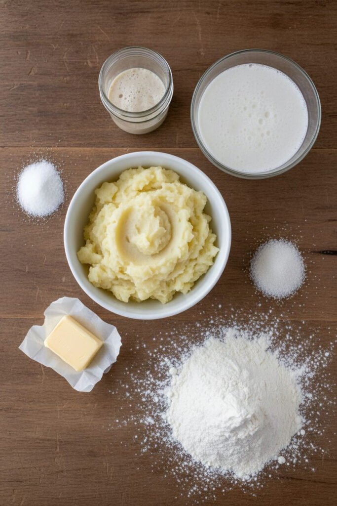 Now, let’s make the dough. Put the mashed potatoes in your mixer bowl. Add the milk, salt, sugar, butter, and your bubbly starter. Then add all the flour. Let the mixer knead it for you. It will look messy at first. Just wait. It will become a smooth, soft ball.