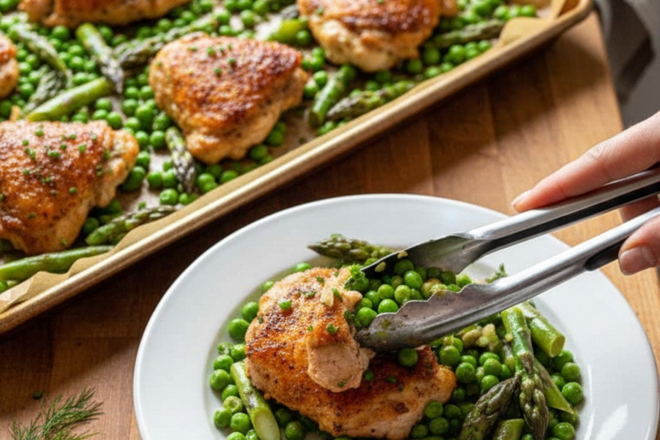 For bone-in skin-on chicken thighs, bake about 10 minutes after browning. The chicken must reach 165 degrees inside. The peas and asparagus are cooked before going in the oven. You just warm them in the sauce at the end. This keeps your healthy spring dinner vibrant and not mushy.