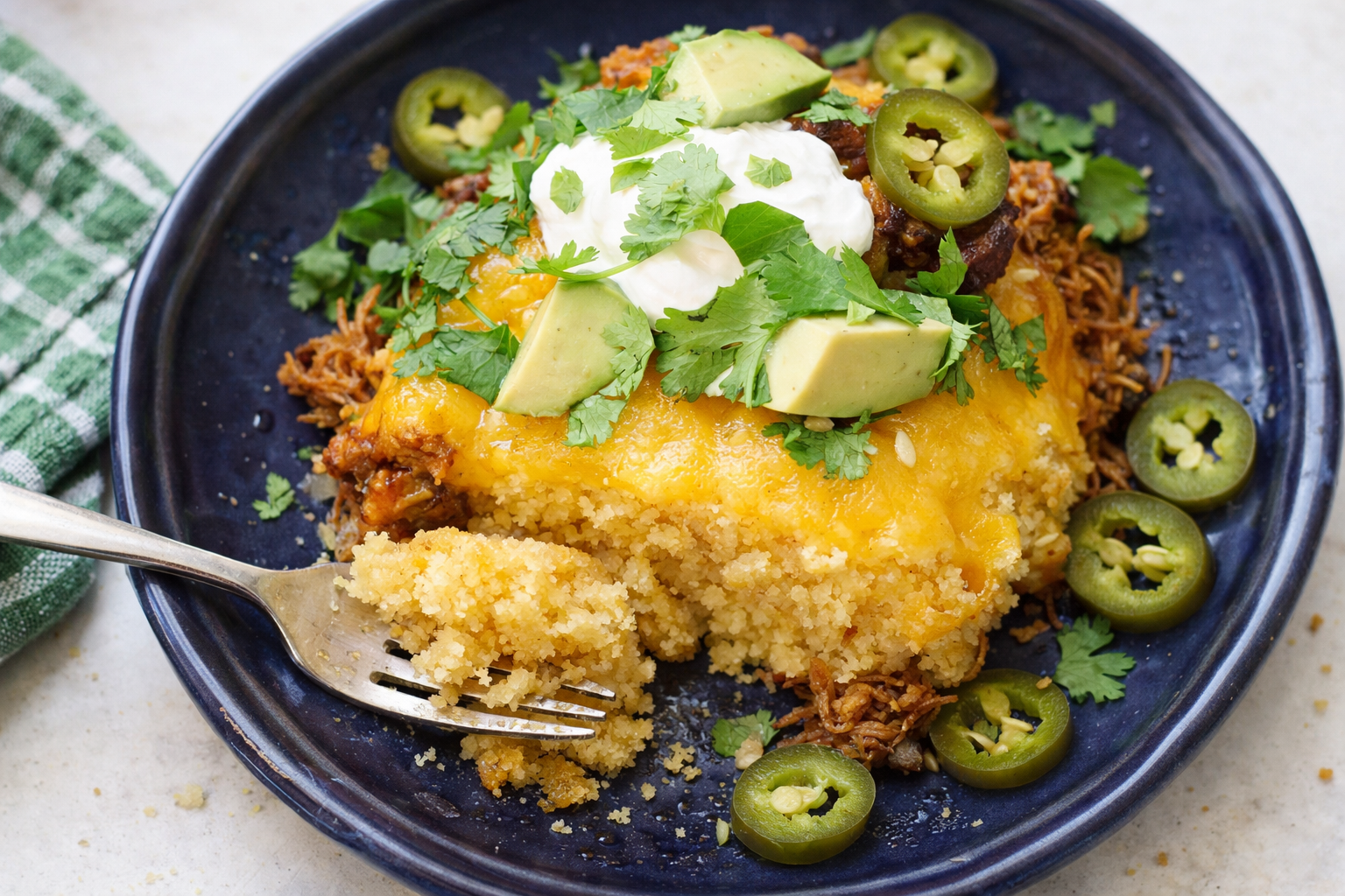 A quick and flavorful tamale pie with tender carnitas and cheesy cornbread topping.