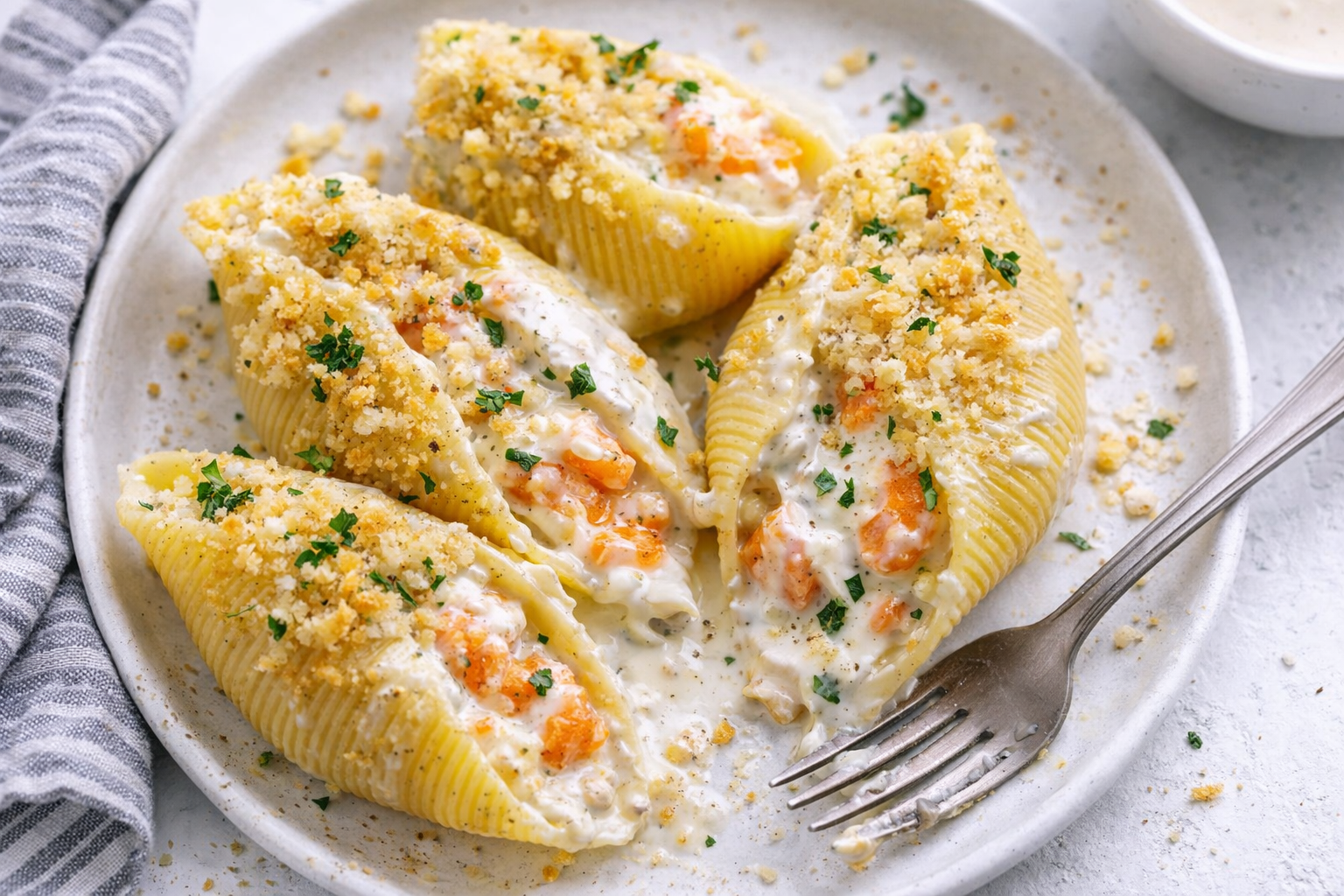 Enjoy a rich and creamy seafood filling stuffed into jumbo pasta shells, topped with a crispy breadcrumb mixture.