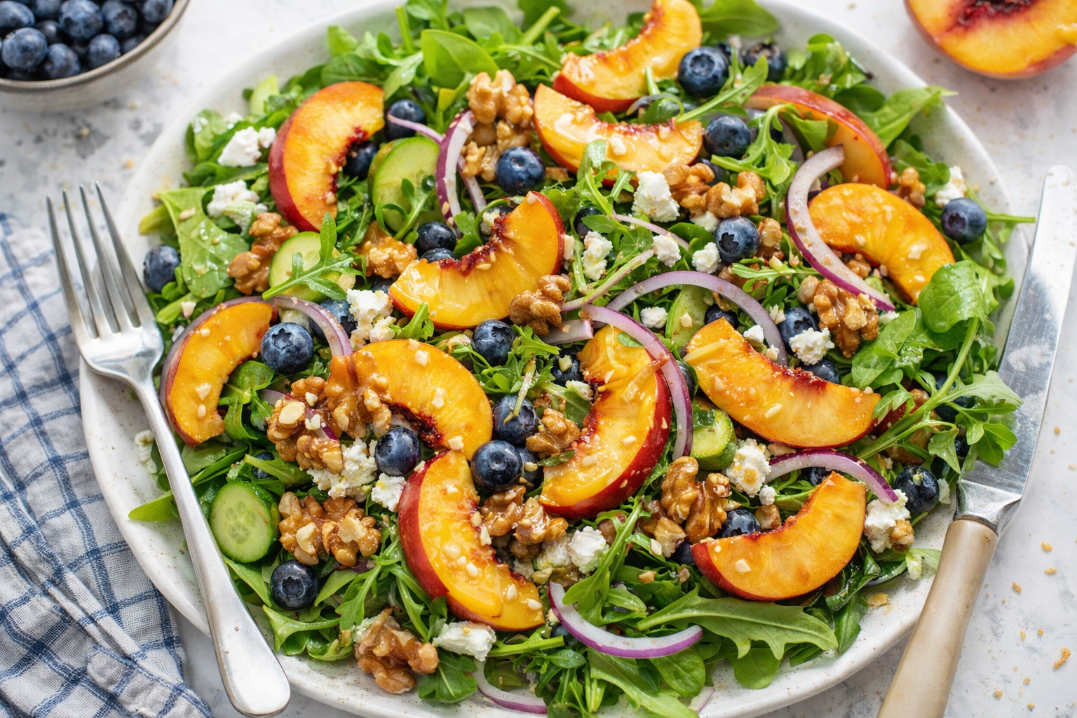 Spicy Kick Swap candied walnuts for chili-lime roasted pepitas. Adds crunch and heat. Protein Power Toss in grilled chicken or chickpeas. Makes it a full meal. Winter Version Use pears instead of peaches, dried cranberries for blueberries. Cozy vibes. Which twist would you try first? Vote in the comments!Serving & Sipping Ideas