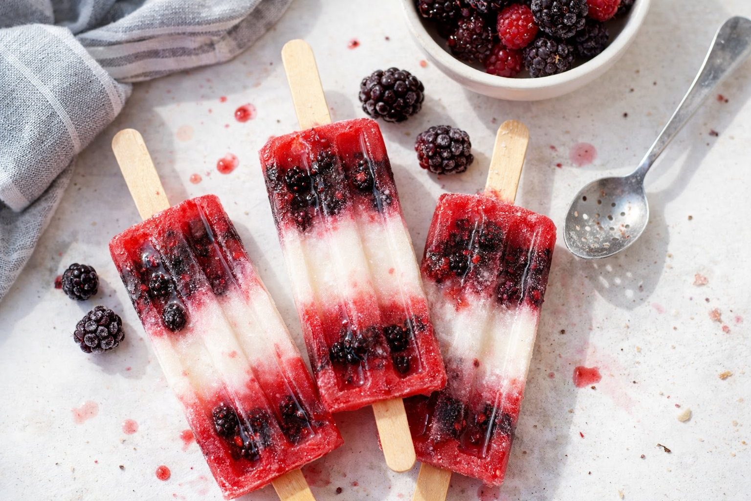 Blend last 1/2 cup berries with water. Top off molds. Add sticks. Freeze 4 hours or overnight.