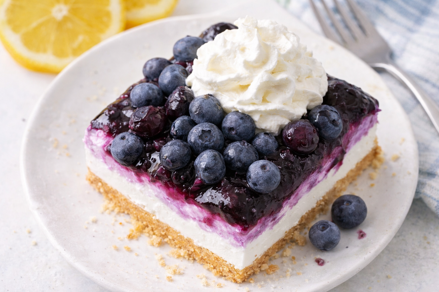 A refreshing no-bake dessert with a lemony cream cheese layer and sweet blueberry topping.