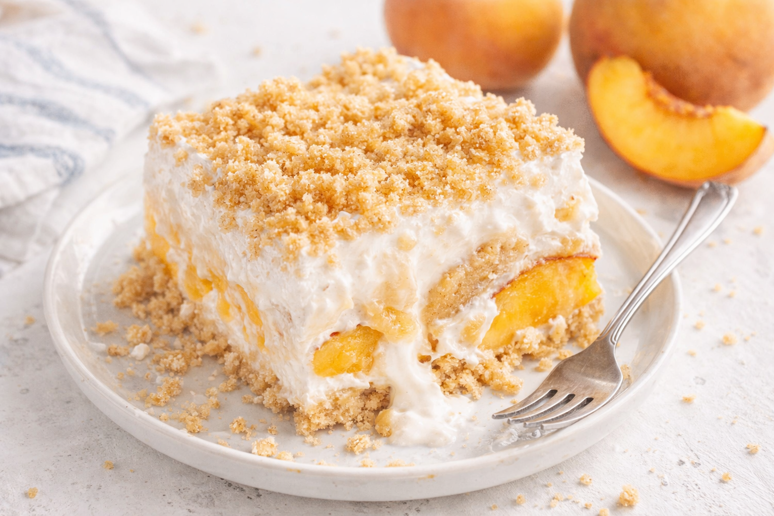 Experience the delightful contrast of textures and flavors with this Peaches and Cream Dream Delight, featuring a graham cracker crust, creamy filling, and fresh peaches.