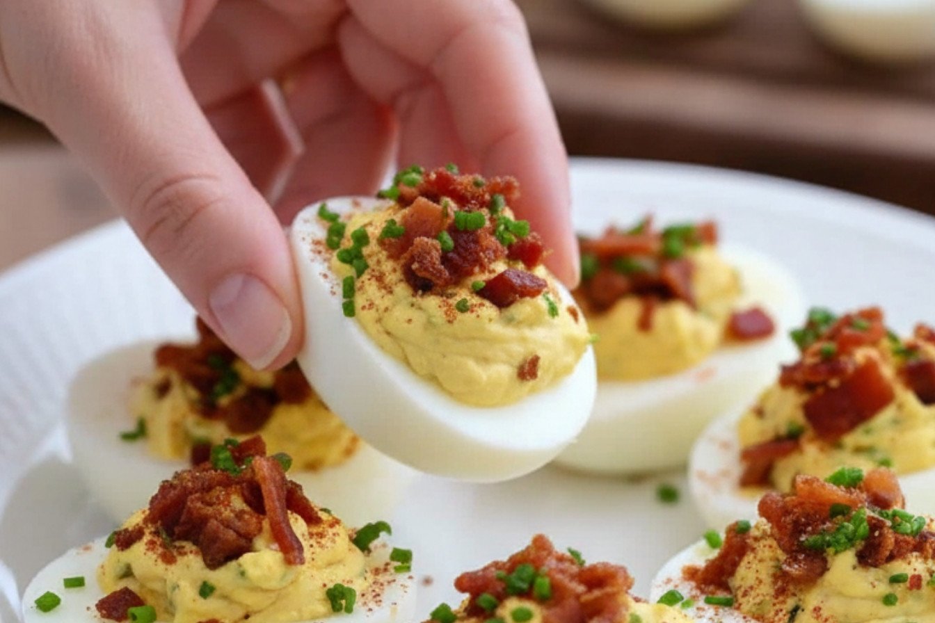 Start with perfect hard boiled eggs. Peel and halve them. Mix the yolks with mayo, mustard, and relish. Then stir in chopped chives and crispy bacon crumbles. Spoon this creamy mix back into the whites. Top with more chives, bacon, and a sprinkle of paprika. This creates the best deviled eggs with bacon and chives for any gathering.