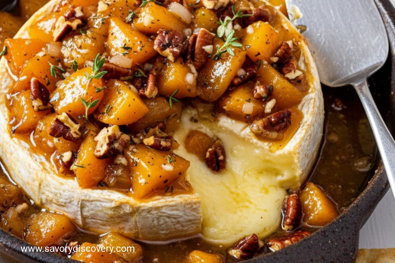 A warm, elegant appetizer featuring creamy baked Brie topped with sweet peaches, tangy shallots, and crunchy toasted pecans.