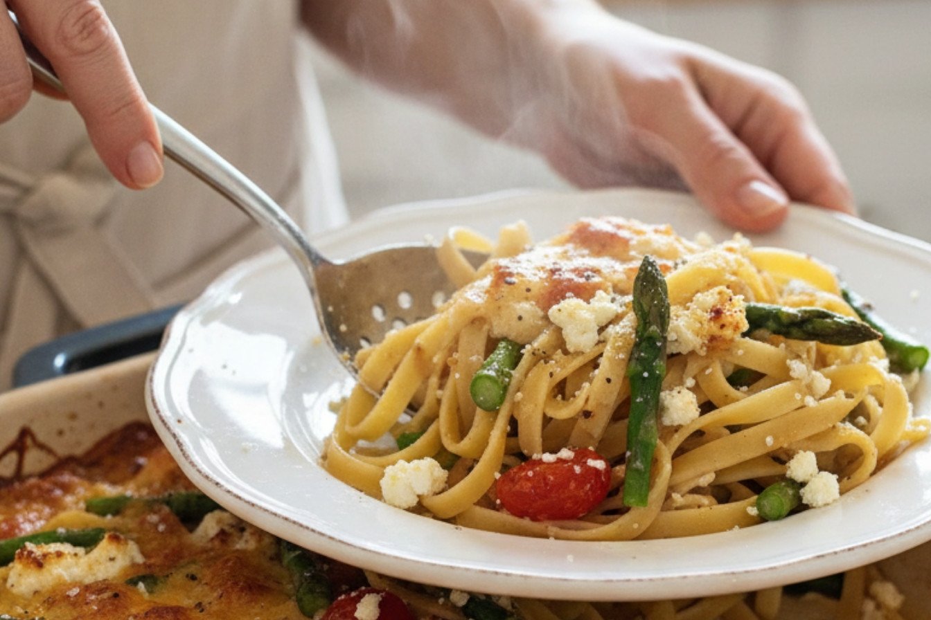 A vibrant and easy pasta bake featuring fresh asparagus, sweet tomatoes, and tangy feta cheese, perfect for a springtime meal.