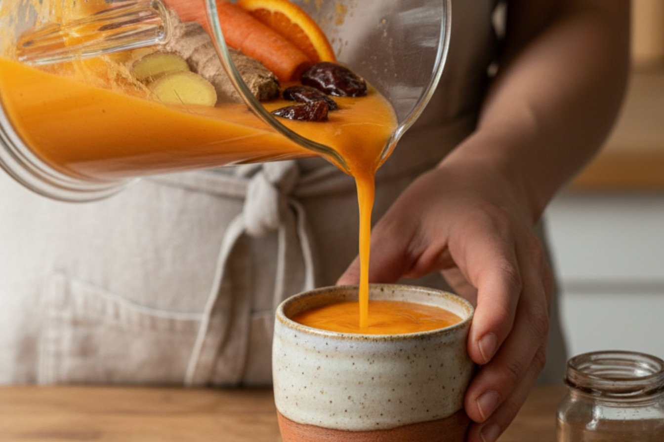 Use the recipe right above! Blend almond milk, carrot, ginger, and orange. Add cinnamon and a nutmeg pinch. This creates a perfect plant-based smoothie. The ginger and carrot work together. They help soothe and support your digestion every single morning.