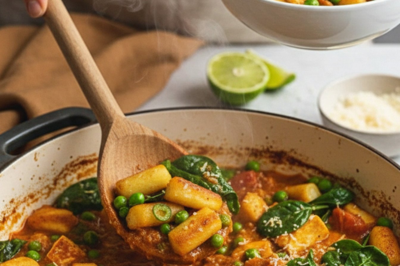 Step 6: Stir peas, beans, spinach, and all the gnocchi into the sauce. Warm everything through gently. Finally, top with crispy curry leaves and grated paneer. Serve with lime wedges for a bright finish. You did it!
