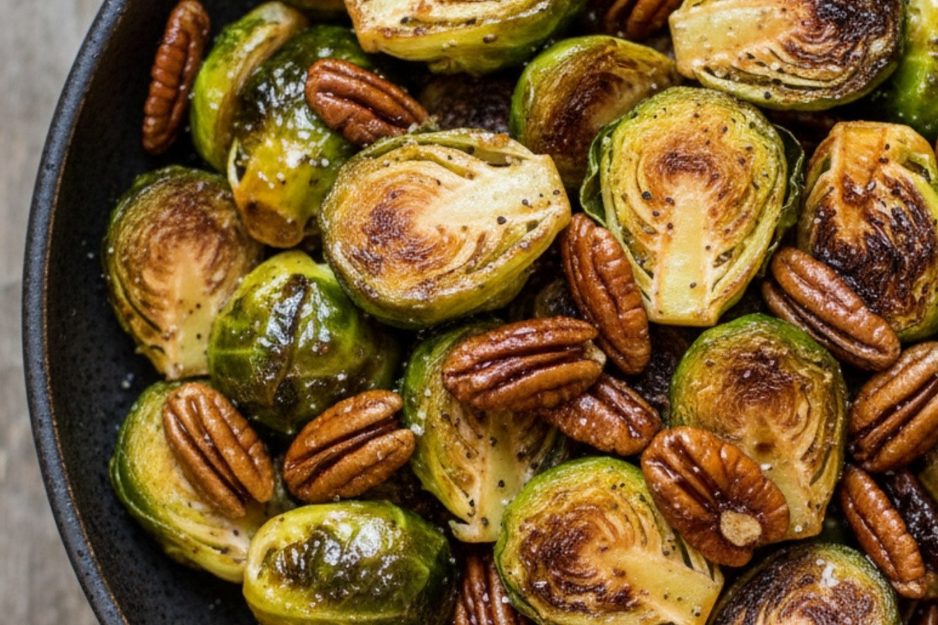 A savory and sweet side dish featuring caramelized Brussels sprouts with toasted pecans and a maple glaze.