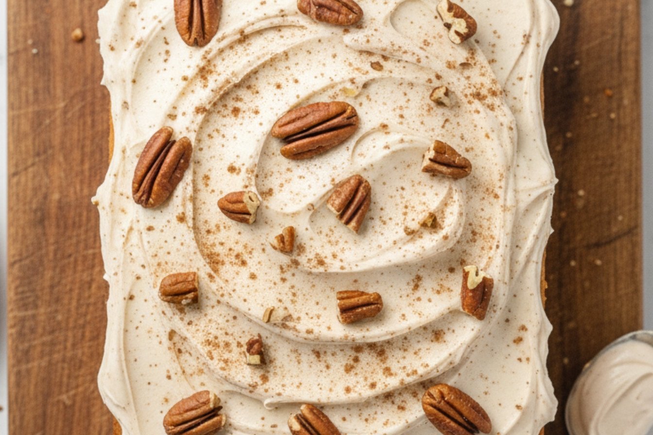 Beat the butter and cream cheese until they are light. It should look like fluffy clouds. Then add the sugar slowly. This keeps it smooth, not gritty. Sprinkling toasted pecans on top gives a nice crunch.