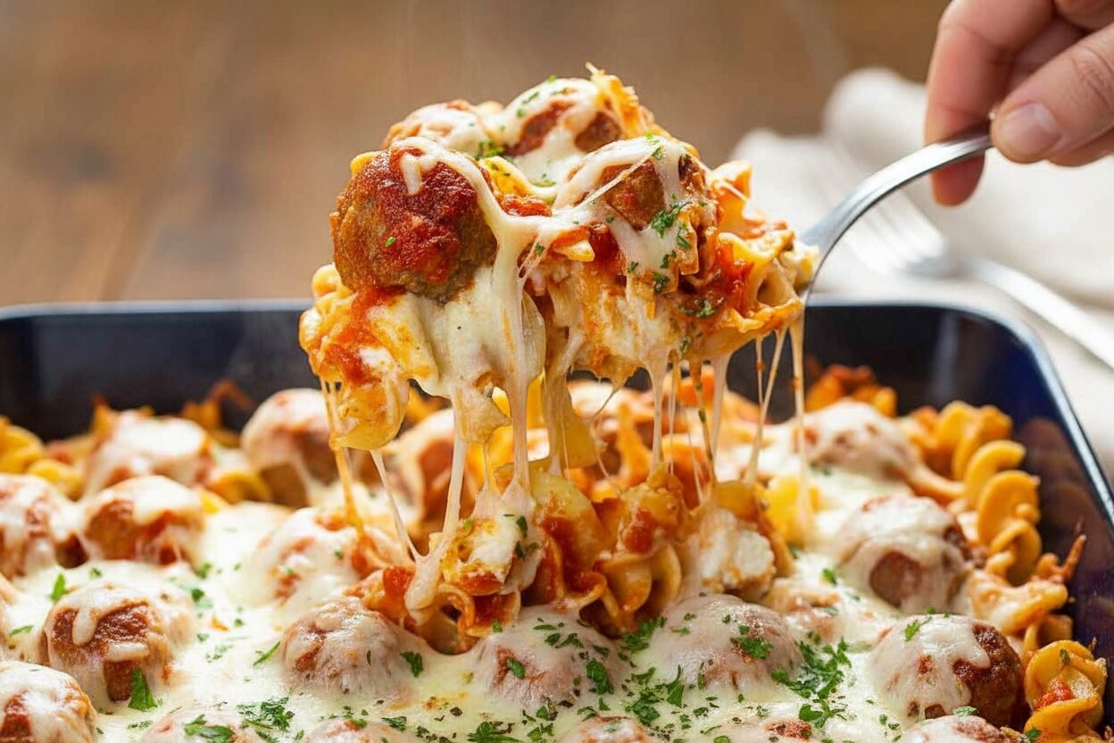 A comforting and hearty dinner casserole featuring tender meatballs, creamy cheese sauce, and egg noodles, all baked to perfection.