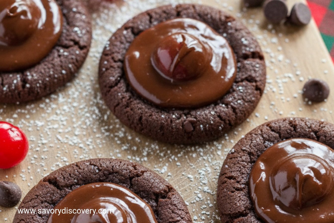 Step 4: Spoon a teaspoon of the warm chocolate sauce over each cherry. Try to cover it like a chocolate blanket. Bake for 10 to 12 minutes. Switch the pans halfway for even baking. (Watch them closely—they are done when just set, not hard.) What kitchen smell makes you happiest? Share below! Let the cookies cool completely on a rack. The chocolate will set into a perfect, fudgy cap.