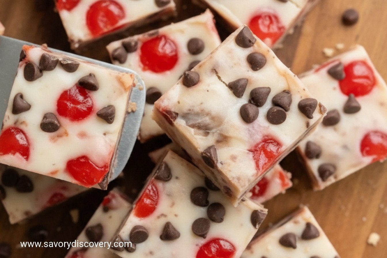 Lift out the fudge. Cut it into squares. See how the cherries peek out? Each piece is a surprise. It’s rich, sweet, and a little tart.
