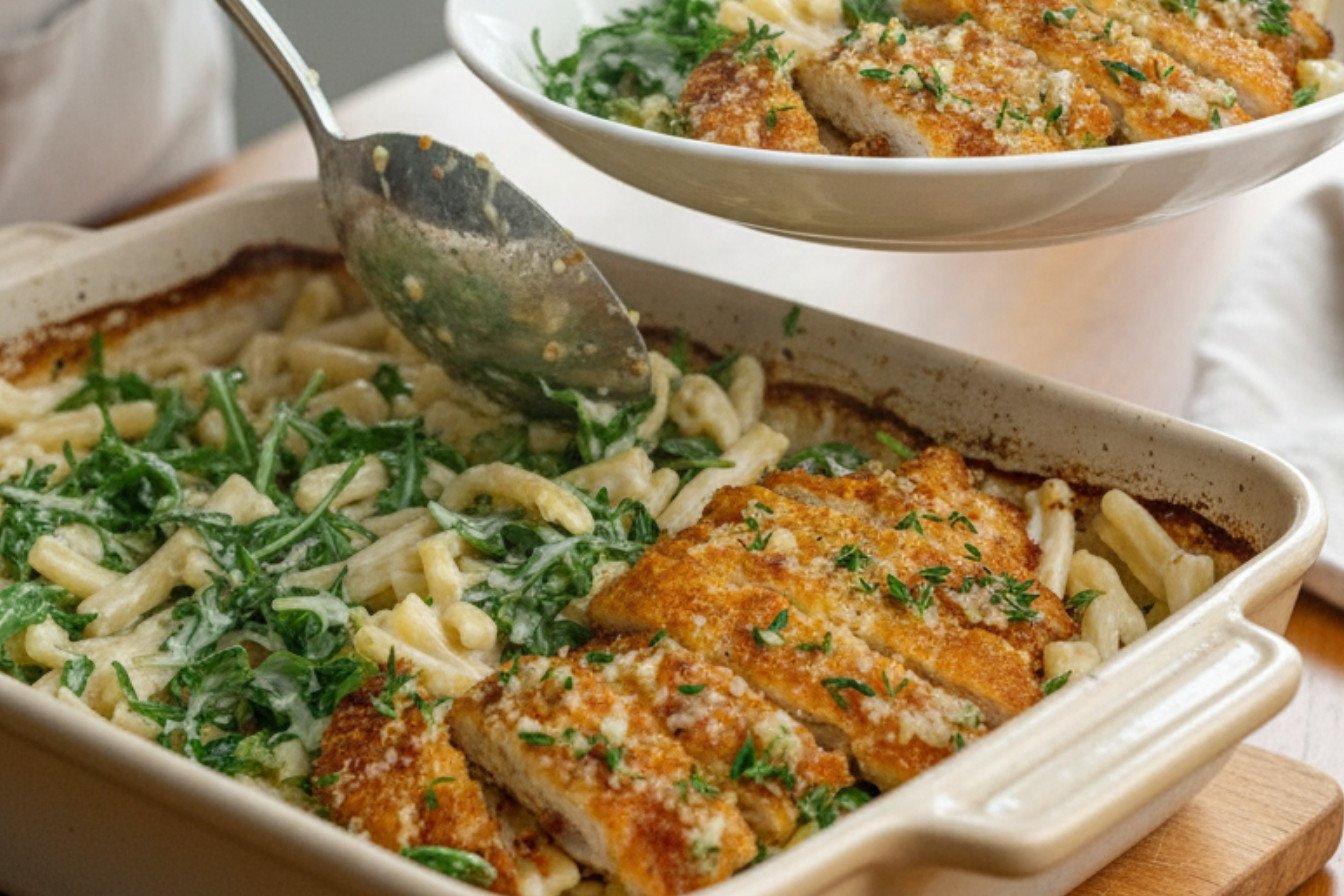 I love a dinner that feels like a hug. This one does just that. It mixes crispy chicken with a creamy, garlicky pasta. The arugula adds a nice little peppery bite. Doesn’t that sound good?