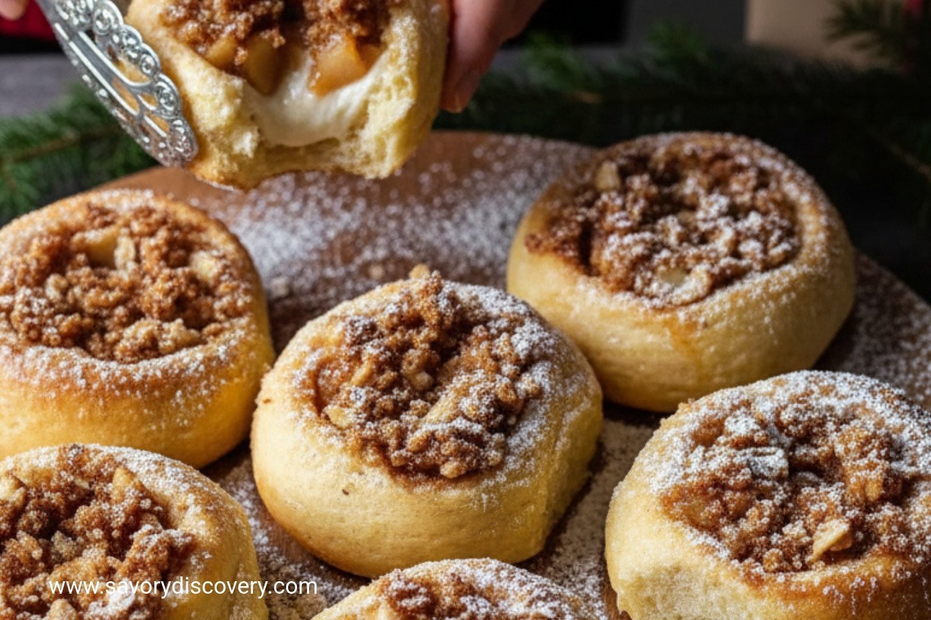 These festive Cinnamon Apple Cheesecake Buns combine soft dough, a creamy apple filling, a crunchy oat crumble, and a sweet glaze for a perfect holiday treat.