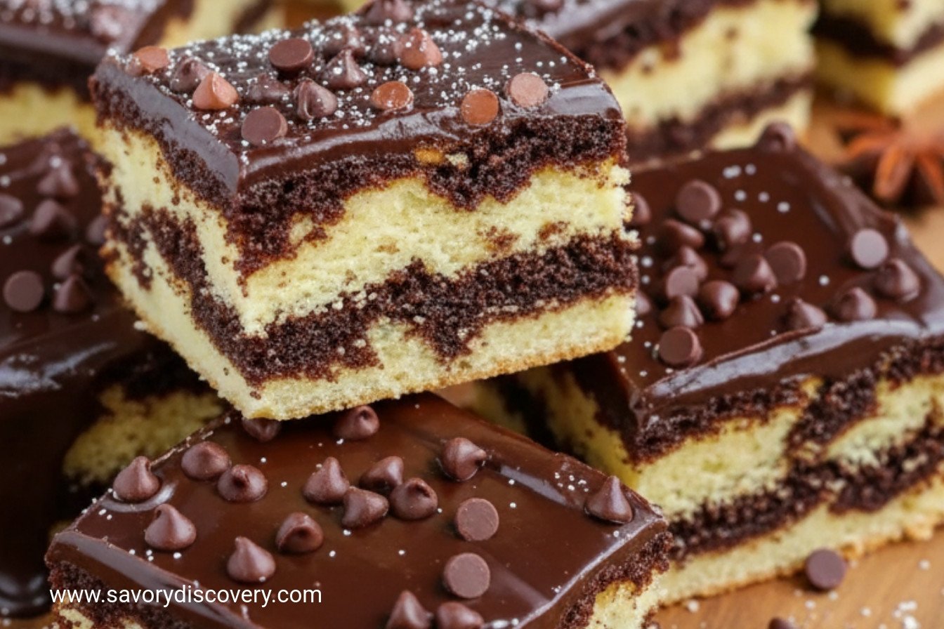 Warm, spiced cake squares with a cinnamon swirl and a rich chocolate glaze, perfect for holiday gatherings.