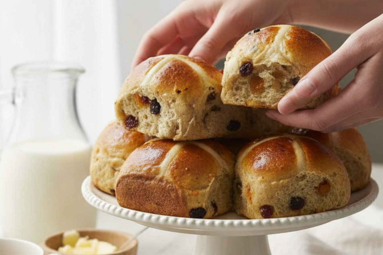 You’ll mix in plump raisins and currants. These raisin and currant buns get so soft and sweet. *Fun fact: the cross on top isn’t just for looks. It started as a simple way to mark the buns as special.* What’s your favorite thing to bake with someone else?