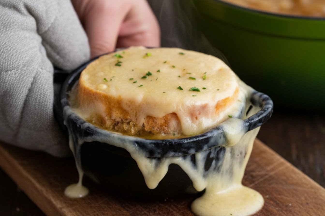 Do not worry! Swiss cheese is your best bet. It is easy to find. A mix of mozzarella and Parmesan is another fix. Mozzarella gives you stretch, and Parmesan adds a salty bite. This combo works well on your How to make French Onion Soup project. Your soup will still be wonderfully cheesy.
