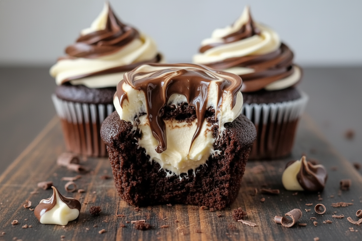 Step 5: Core the cool cupcakes and pipe the cream inside. Then, make the chocolate ganache. Heat cream, pour it over chopped chocolate, and stir. Let it thicken a bit. Drizzle it over each cupcake. Let it set. Then, enjoy your masterpiece!