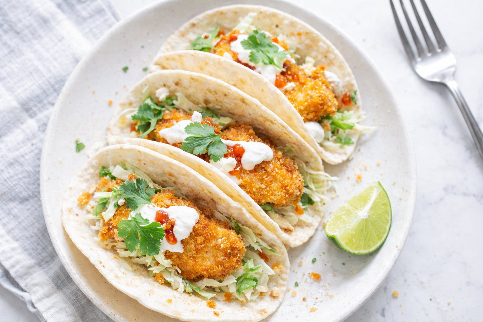 Step 1 Mix cornmeal and Southwest seasoning on a plate. This adds crunch and flavor. Keep it handy for coating. Set aside. Step 2 Pat tilapia dry with paper towels. Moisture makes coating soggy. Dry fish sticks better. Handle gently. Step 3 Press fillets into the cornmeal mix. Coat both sides and edges. Shake off extra. Lay on a clean plate. Step 4 Heat oil in a skillet over medium-high. Test with a water drop—sizzle means it’s ready. Don’t overcrowd the pan. Step 5 Cook fish 2 minutes per side. Golden brown means crispiness. Check temp hits 145°F. Use a meat thermometer. Step 6 Drain fish on a wire rack. Foil under catches drips. Keep warm in a 170°F oven if needed. Step 7 Break fish into chunks for tacos. Serve with tortillas and toppings. Enjoy hot for best texture. *(Hard-learned tip: Overcrowding the pan lowers oil temp. Fish steams instead of crisps. Cook in batches!)* What’s the best way to test oil temp without a thermometer? Share below! Cook Time: 15 minutes Total Time: 25 minutes Yield: 6 servings Category: Dinner, Seafood3 Fun Twists on Fish Tacos