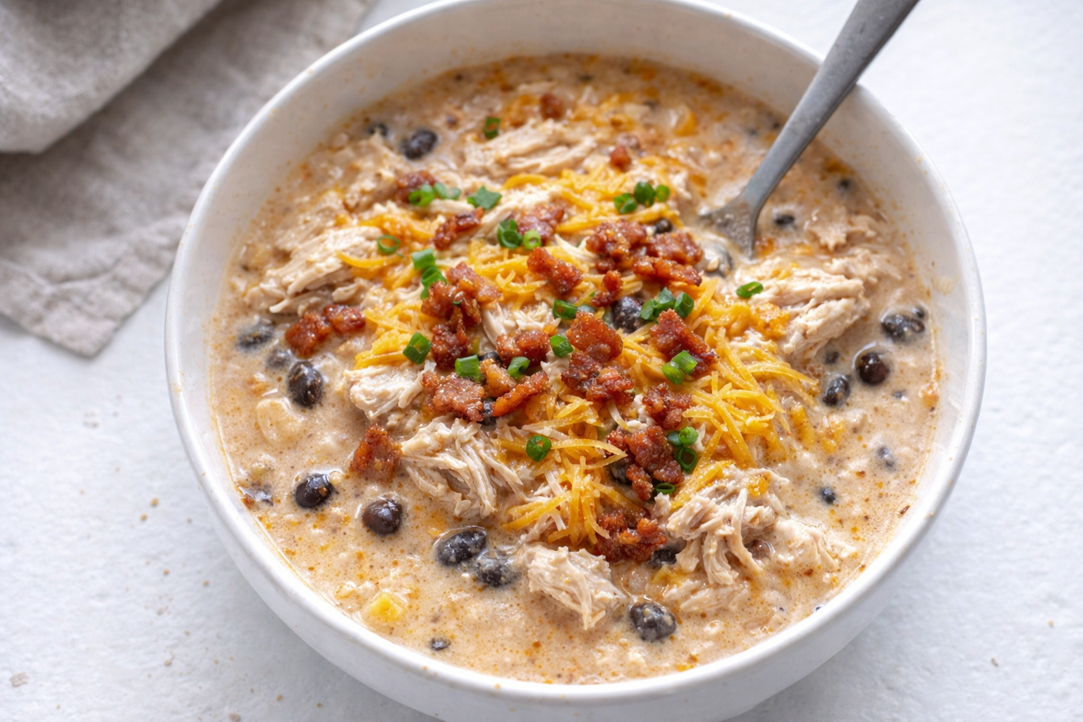 Step 1 Grab your slow cooker and add the chicken first. Layer onion, beans, corn, and tomatoes on top. Pour in broth and spices. Drop cream cheese in chunks for easy melting. (Hard-learned tip: Stir cream cheese halfway to avoid clumps.) Step 2 Cook on high for 4 hours. Stir once or twice if you’re nearby. Meanwhile, bake bacon at 375°F until crispy. Blot grease with paper towels. Step 3 Crumble cooled bacon into the chili. Check chicken temp—165°F means it’s done. Shred chicken, mix back in. Top with cheddar and serve. What’s your go-to chili topping? Share below! Cook Time: 4 hours Total Time: 4 hours 5 minutes Yield: 10 servings Category: Dinner, Soup3 Twists on This Comforting Chili