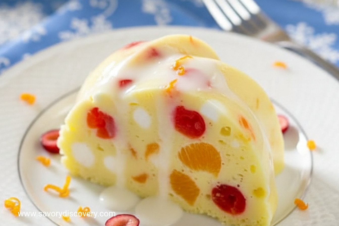 This shimmering crown is pure holiday magic. My granddaughter calls it “the jeweled cake.” It’s not really a cake, of course. It’s a cool, creamy, fruity delight. I’ve been making it for decades. Doesn’t that smell amazing? The pineapple and coconut together are like a tropical hug. The marshmallows make it dreamy. And those cherries and oranges? They look like little gems hidden inside. It always feels like a celebration on a plate. I still laugh at the year my cat tried to steal a cherry from the counter. Let’s make some new memories with it.