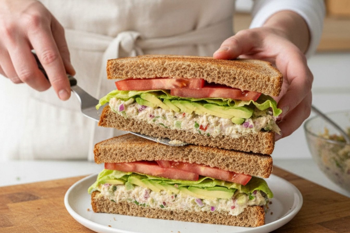 Step 3: Toast your bread until it’s golden. Spread the creamy avocado tuna salad sandwich mix on two slices. I still laugh at how my grandson gobbles this up. It’s a perfect high-protein lunch.
