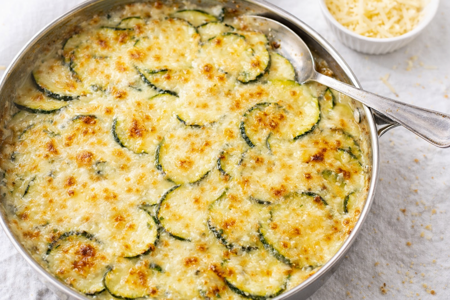 A creamy, cheesy zucchini gratin, made with simple ingredients, comes together quickly for an impressive side dish.