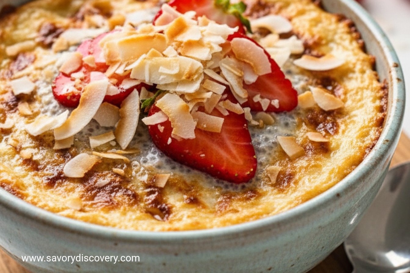 Step 4: Time to serve! Slice some fresh strawberries. Drizzle them with a little maple syrup. Spoon your thick pudding into a bowl. Top with berries and extra coconut. It’s like a tropical vacation in a dish. I still smile every time.