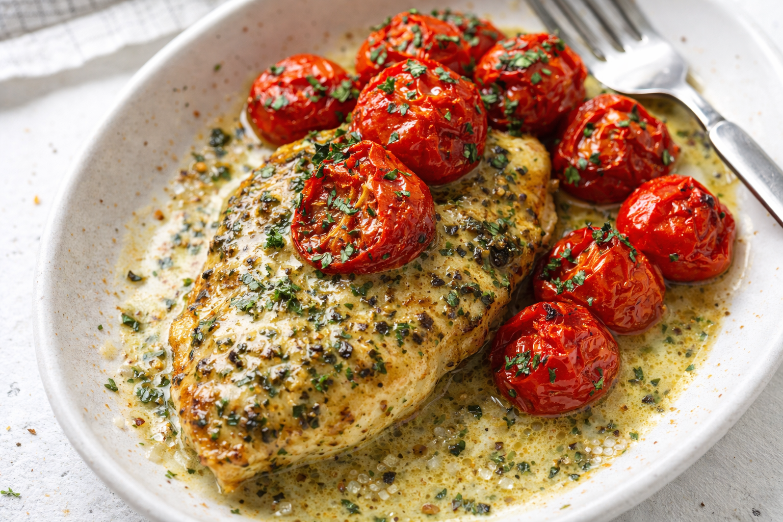 Creamy Pesto Chicken with Roasted Tomatoes Dinner