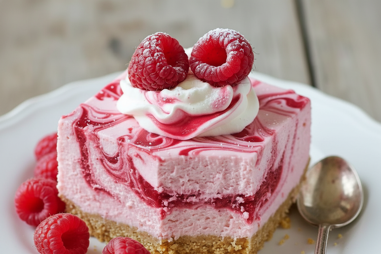 Indulge in a luscious and creamy cheesecake with a sweet-tart raspberry swirl, set on a buttery graham cracker crust.