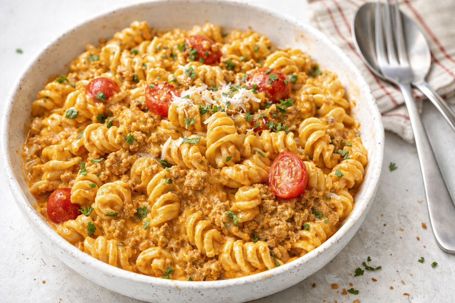 Step 1 Boil salted water in a large pot. Add cavatappi pasta and cook until al dente. Save ½ cup pasta water before draining. Set pasta aside for later. (Hard-learned tip: Undercook pasta slightly—it’ll finish in the sauce.) Step 2 Heat olive oil in a skillet over medium heat. Brown ground beef with diced onion. Cook until beef is done and onion is soft. Drain extra grease if needed. What’s the best way to soften onions fast? Share below! Step 3 Stir in garlic and tomato paste. Cook for 1 minute, stirring nonstop. This deepens the flavor. Don’t let the paste burn. Step 4 Add Rotel tomatoes, beef broth, and Worcestershire sauce. Sprinkle in chili powder, paprika, and salt. Stir well and simmer for 10 minutes. The sauce will thicken slightly. Step 5 Reduce heat to low. Mix in heavy cream and softened cream cheese. Stir until smooth. Add shredded cheeses and melt fully. Step 6 Toss cooked pasta in the sauce. Thin with reserved pasta water if needed. Garnish with parsley, tomato, and jalapeño. Serve hot. Cook Time: 35 minutes Total Time: 45 minutes Yield: 6 servings Category: Dinner, Tex-Mex3 Twists on This Tex-Mex Classic