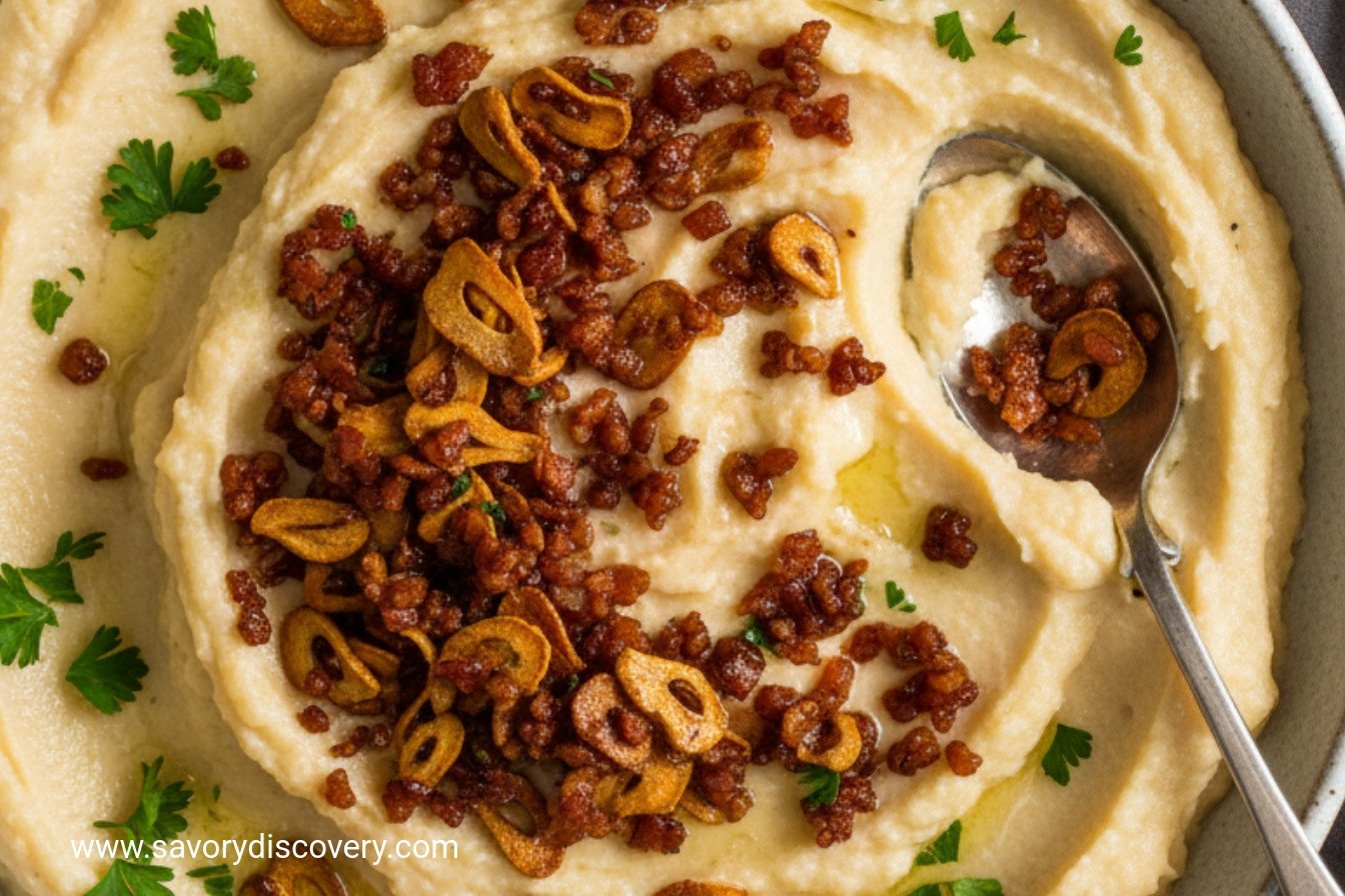 Celery Root Puree with Bacon, Garlic, and Parsley Topping