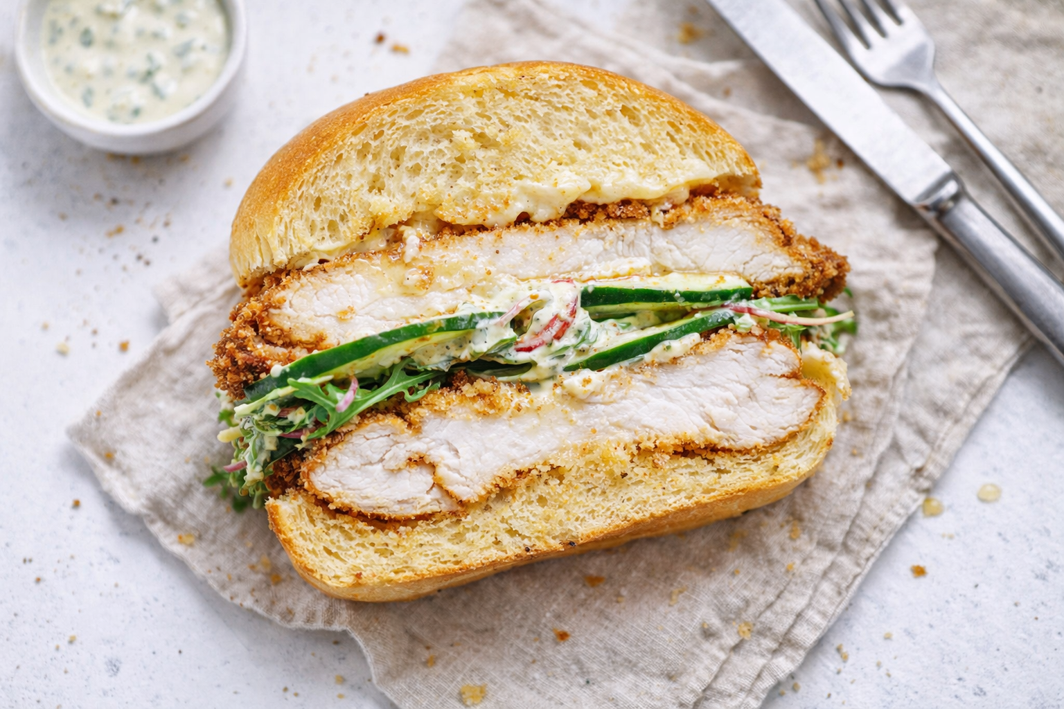 - Cut the baguette into four equal-sized sandwiches. Cut each in half horizontally. To assemble, smear the bottom half of each sandwich with desired amount of mayonnaise. Place the crispy chicken on top. Divide the cucumber salad equally among the four sandwiches. Smear the top half of each bread with mayonnaise, if desired. Place on the top buns and serve immediately.