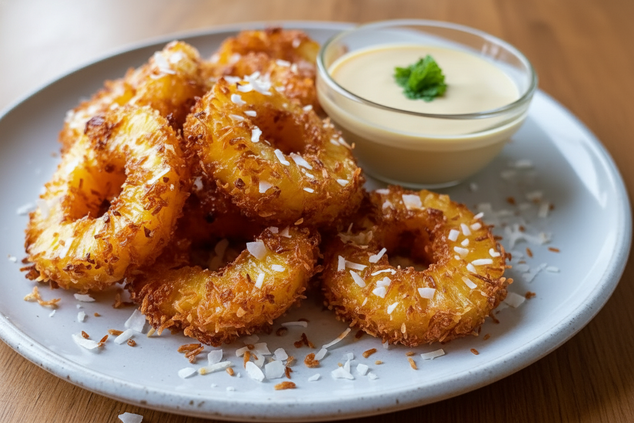 Crispy, golden-brown pineapple fritters soaked in rum and coated in sweet coconut, served with a creamy rum-infused dipping sauce.
