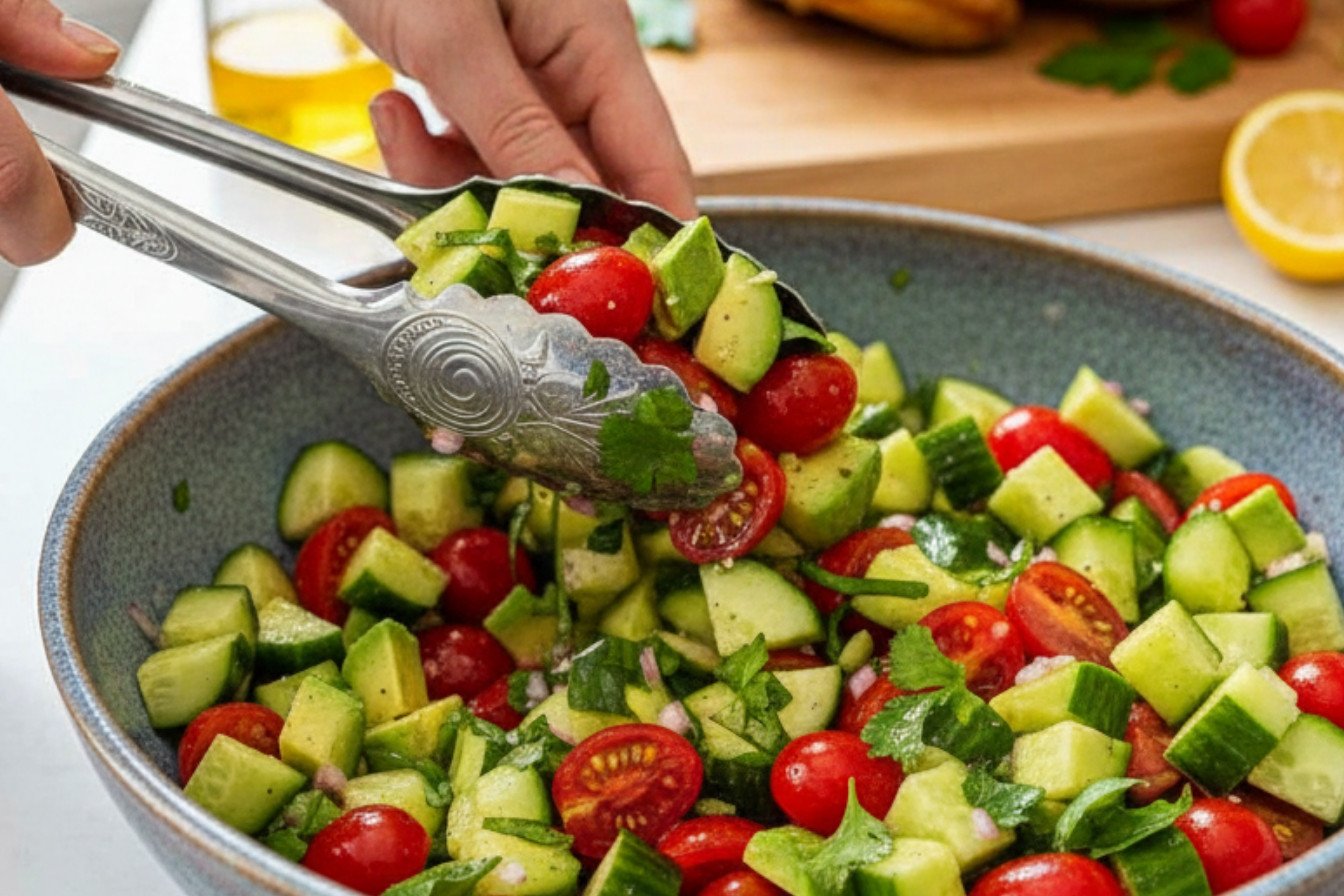 A fresh and vibrant salad featuring creamy avocado, crisp cucumber, and sweet tomatoes tossed in a zesty lemon dressing.