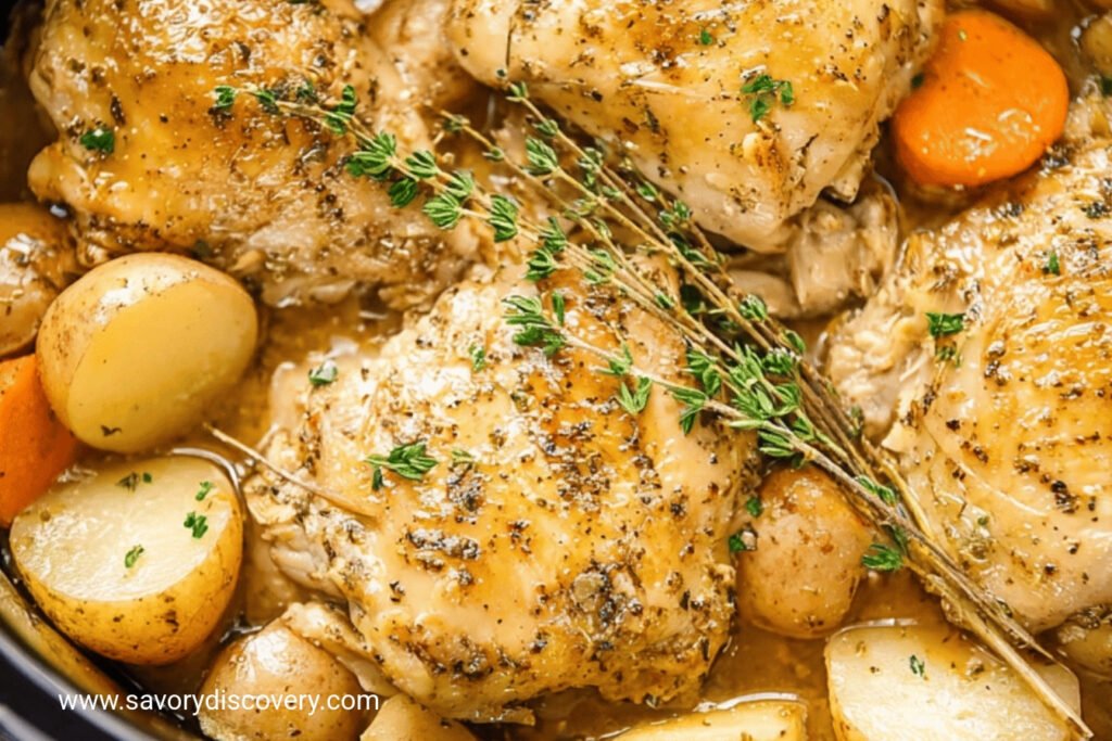 Step 1 Brown your chicken thighs in a hot skillet first. This step adds so much deep flavor. Do not rush the browning process. (My hard-learned tip: pat the chicken skin very dry first for a perfect sear). Step 2 Cook your onions in the same pan. They will soak up all the tasty chicken bits. Add garlic and tomato paste for a rich base. Stir in the flour to thicken your sauce. Step 3 Pour in water and add the crushed bouillon cube. Let it simmer until it gets a little thick. Those brown bits from the pan make the best gravy. Now your sauce is ready for the slow cooker. Step 4 Place carrots and potatoes in the cooker. Pour your delicious onion gravy over them. Lay the browned chicken on top, skin side up. Now just put the lid on and walk away. What is the secret to a golden, crispy chicken skin? Share below! Cook Time: 3 hours Total Time: 3 hours 50 minutes Yield: 6 servings Category: Dinner, Slow CookerMake It Your Own
