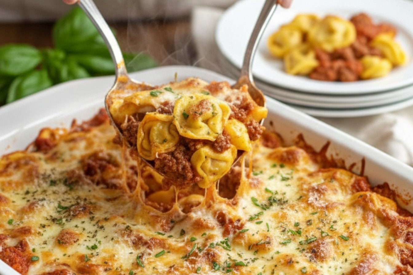 A hearty and comforting casserole featuring cheesy tortellini, savory meat sauce, and a bubbly, golden cheese topping.
